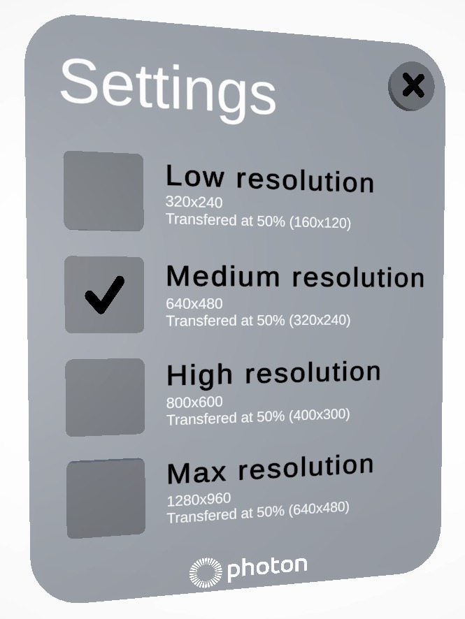 A UI is then displayed, showing the different resolutions supported by the Meta Camera API. The photo resolution is automatically adapted according to the Meta Camera resolution setting and the streamRatio factor.