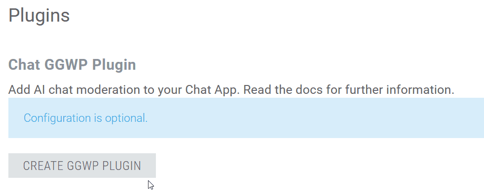Step 4: In the Plugins section, activate the GGWP config by clicking on the “Create [...] Plugin” button and enter all required information.