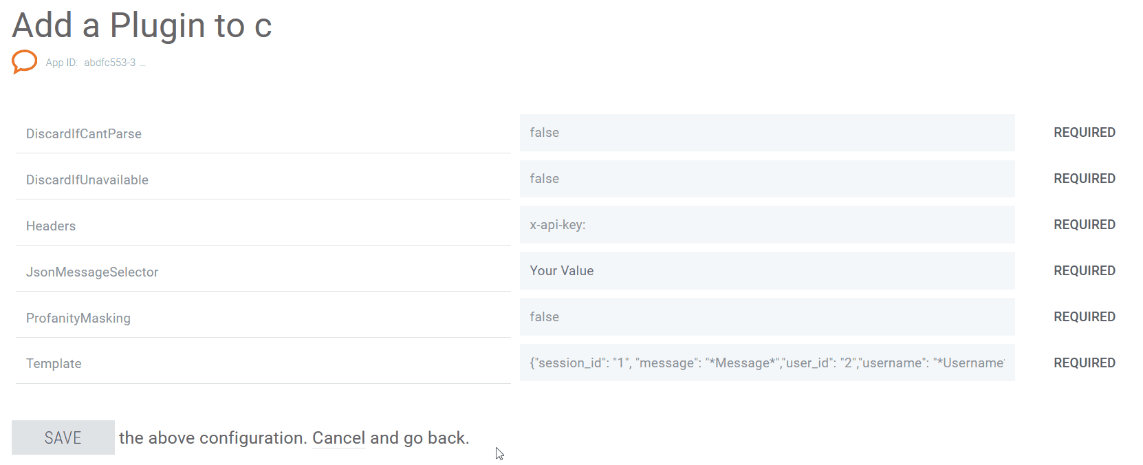 JSON body for POST or right URL part with template to pass into filtering service. Can use following variables, which will be replaced with proper values: Message,