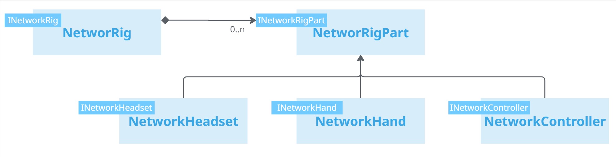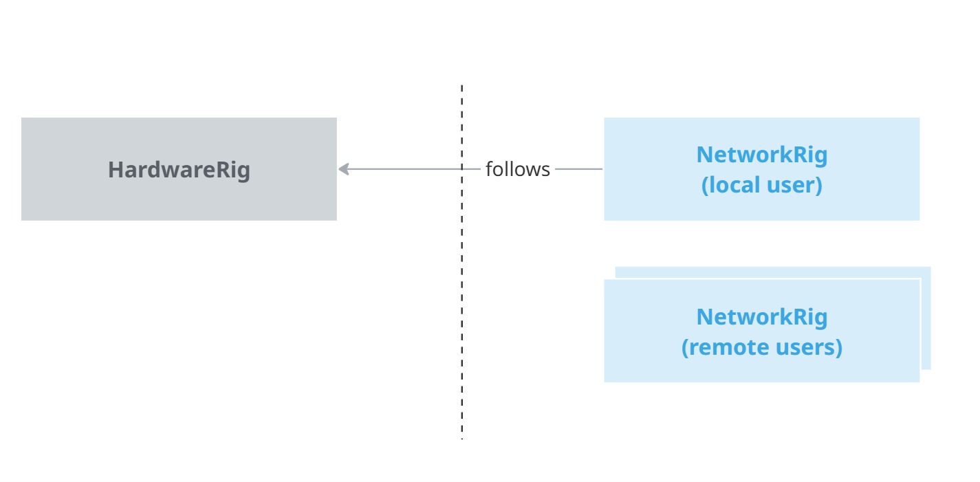 While in a networked session, every user is represented by a networked rig, whose various parts positions are synchronized over the network.