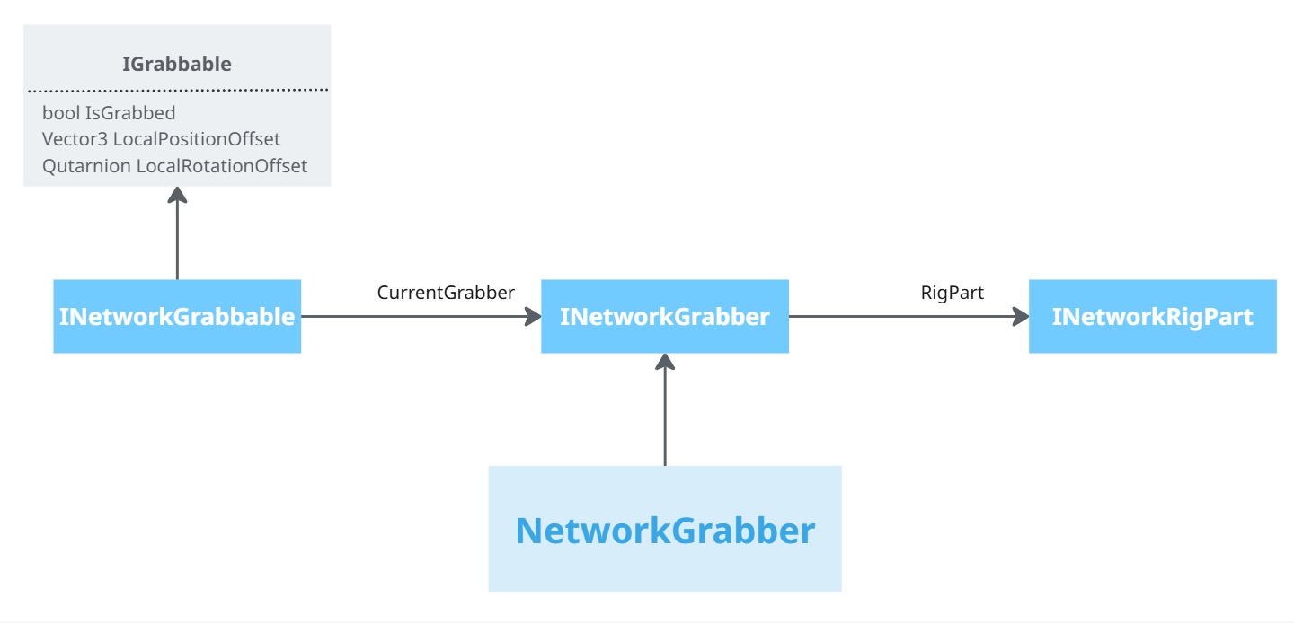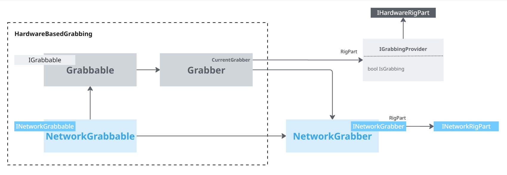 To be able to easily provide grabbing synchronization for interactions stacks grabbing logic, the XRShared core include a basic definition of a grabbable object, through the IGrabbable interface, and a default NetworkGrabber component, to represent a rig part able to grab objects on a network rig.