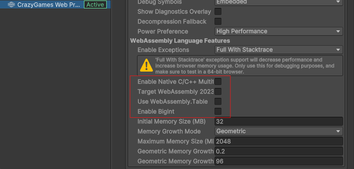 Run In Background옵션을 활성화하세요.CrazyGames Web Profile에 필요한 설정이 기본 적용되어 있습니다. - 가능하다면 개별 텍스처 대신 스프라이트 아틀라스를 사용하세요.