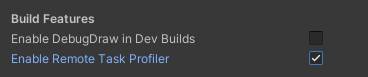 To enable it select the QuantumEditorSettings asset and toggle on Enable Remove Task Profiler. It will add the scripting define QUANTUM_ENABLE_REMOTE_PROFILER to the current selected build platform. The define has to exist for the build platform used to create a build that is profiled.